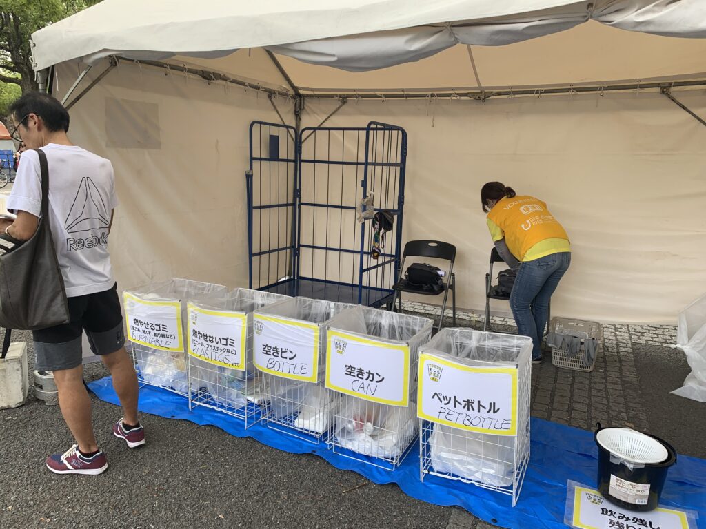エコステーションとは、ゴミ箱が並んでいるテントだ。燃やせるゴミ、燃やせないゴミ、空きビン、空き缶、ペットボトルと、それぞれのゴミ箱を並べて置き、分別を促すという。そう、私が春に活動したメトロックのクリーンボランティアと同じ内容だ。