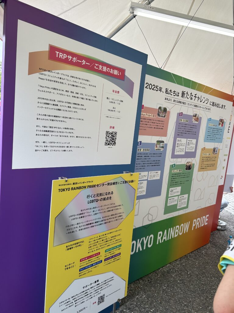 主催者ブースにて、主催者である「東京レインボープライド(略してTRP)」の活動内容の紹介などをするセクションである。