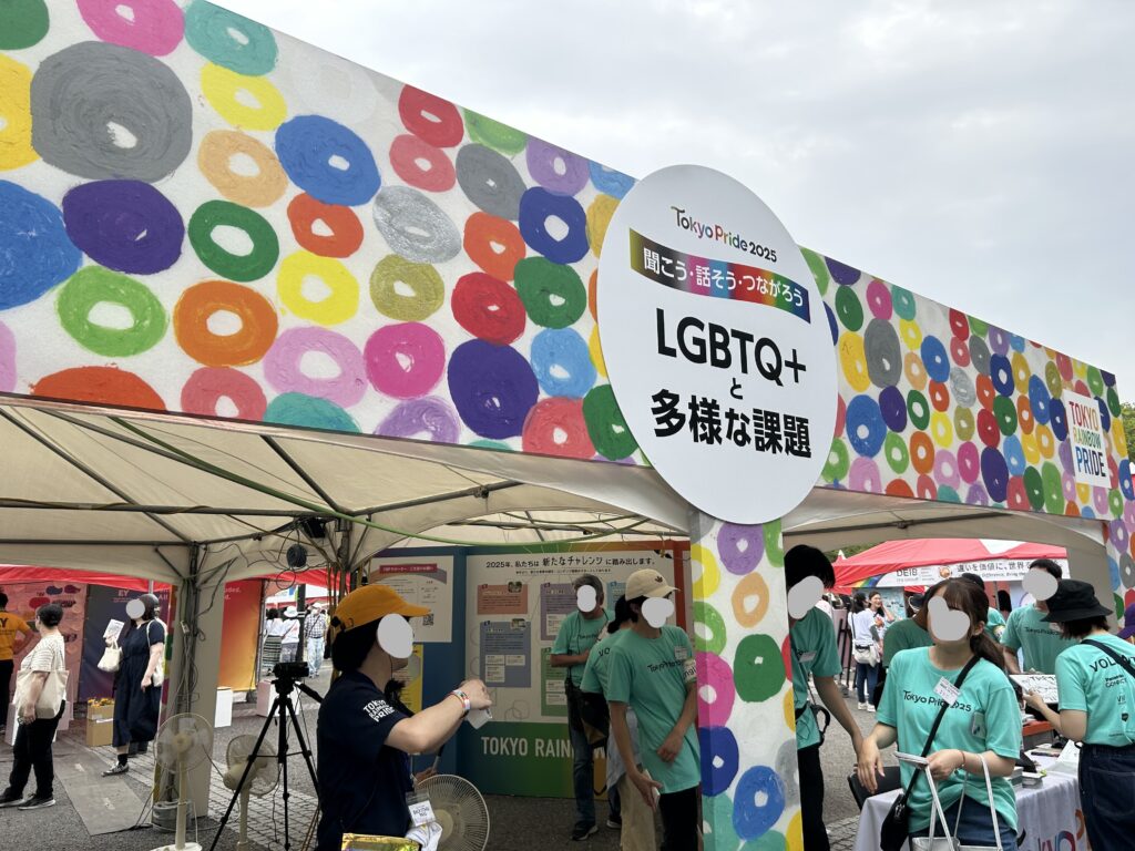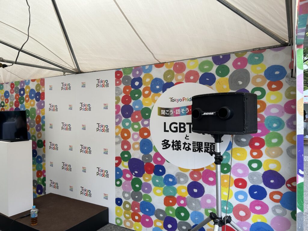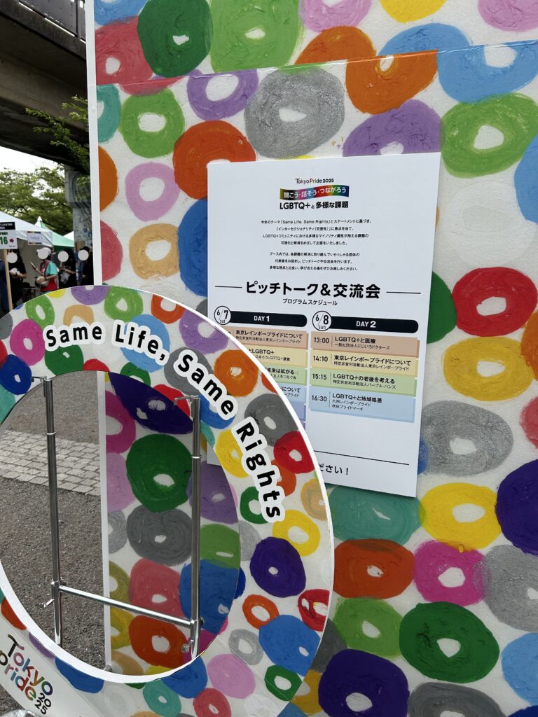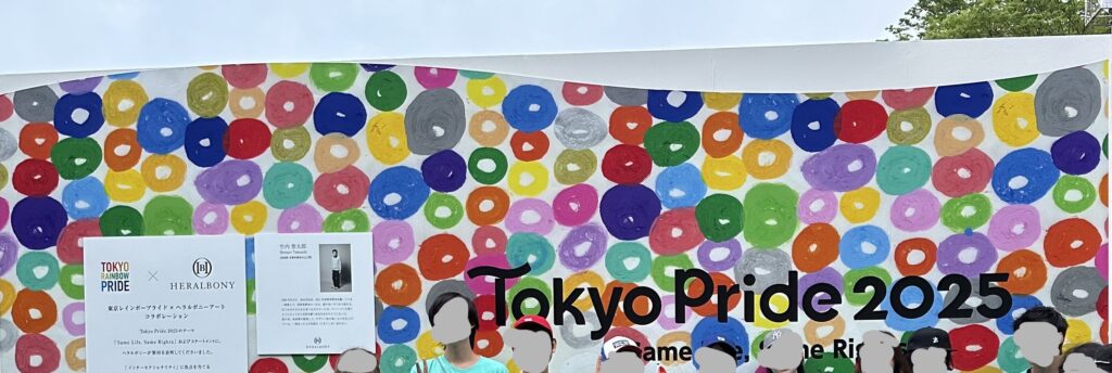 この素敵な壁の前での写真撮影が人気だった。ヘラルボニー(知的障害のある作家さんたちによるアートであり、正規の美術教育を受けていない人のアートを基にしたブランド)協力のもと、アーティスト竹内聖太郎さんの作品「まる」が描かれている。ここにいつも行列が出来ていた。とっても盛り上げ上手なボランティアさんたちがいて、「ハッピープライド!」などと声を掛けて写真を撮ってあげていた。