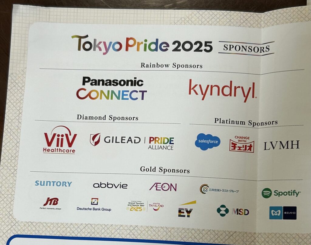 ドラァグクイーンと記念撮影ができるポイントがあり、結婚相談所かな、なんかやっぱり記念撮影ができるスポットがあったり、ヤマハとか日テレとか知っているところのブースがあり、音楽が掛かっていたり、賑やかだった。しかも、人が多い。