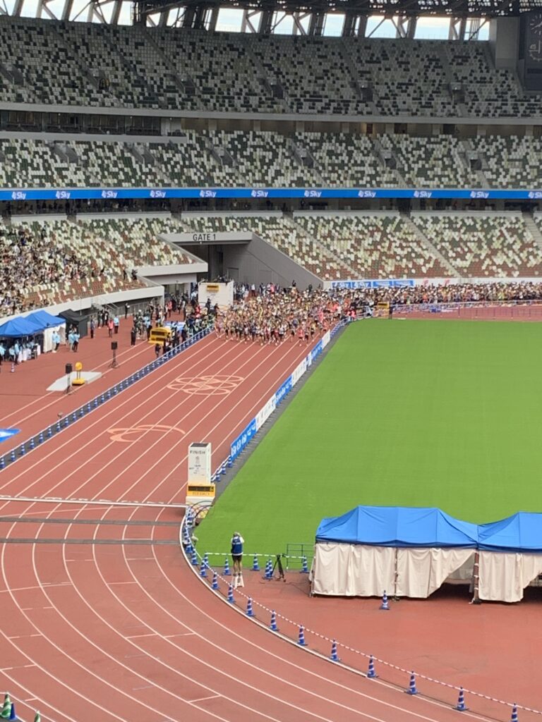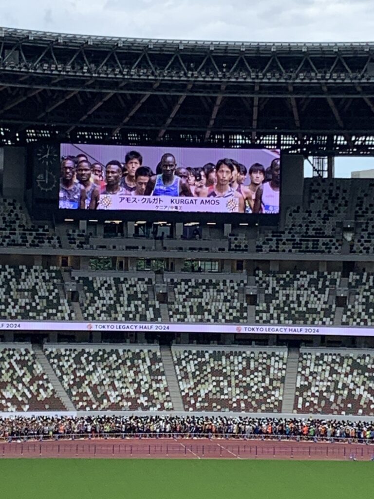 ゴールの瞬間は見ようと、またフィールドを覗いたりした。最初は車いすランナーさんが、そして外国人のトップ選手たちがゴール。ハーフマラソンなので、1時間で帰ってきてしまうのだ。
