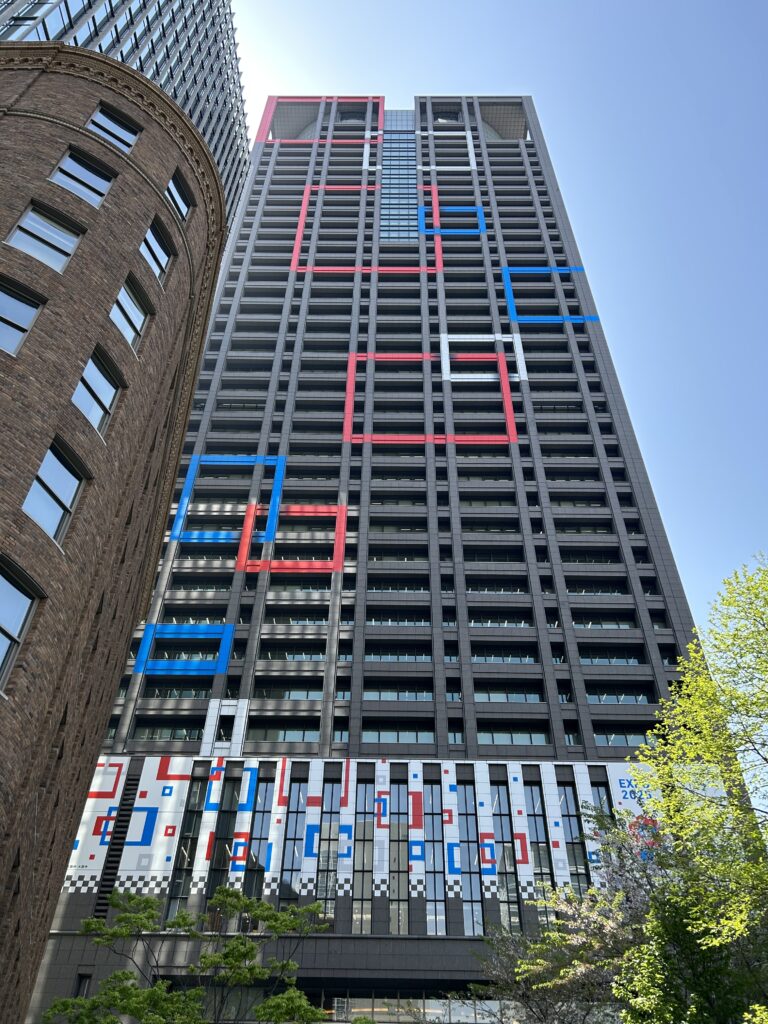 さっきとは別の橋を渡ったが、振り返ったらあの万博カラーの模様のビルが見えた。先ほど写真を撮ったのとは別の方角から見ている。派手なビル、いいね。関電ビルディングらしい。