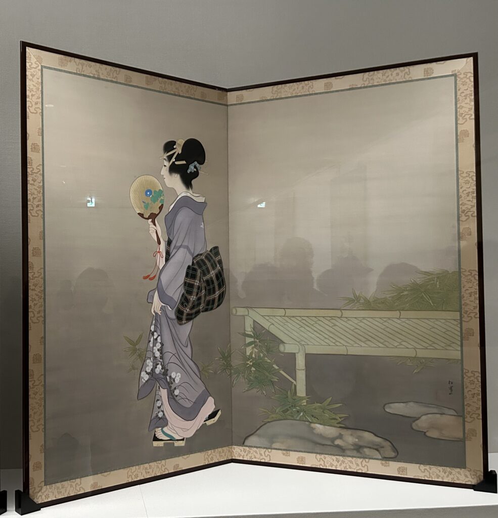 ↑月蝕の宵。鏡を覗き込んでいる女性や子供が描かれ、楽しそうに生き生きと描かれた左隻(上)に対して、右隻(下)には女性の立ち姿ひとりを端正に描いている。右隻の女性は門下生の歌人、九条武子がモデルを務めたという。