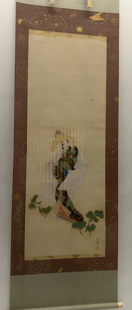 ↑汐くみ。謡曲「松風」から派生した日本舞踊の演目「汐汲」に着想を得たもの。須磨の浦でかつて公卿、在原行平に愛された海女の姉妹、松風と村雨をめぐる物語である。この作品では、松風が行平を想いながら天秤棒に汐汲み桶をつけて踊る姿が描かれている。行平が海辺の松に衣を掛けて去ったことから、桶には松が描かれ、そこには「待つ」の意味も込められている。