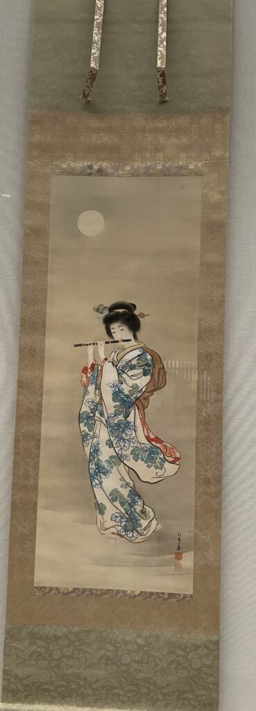 ↑良夜吹笛図(りょうやすいてきず)。松園初期のうねるような太い線も見られるが、顔立ちの柔らかさから過渡期の作品と思われる。女性の左手薬指には指輪が。この当時から結婚指輪の習慣が。