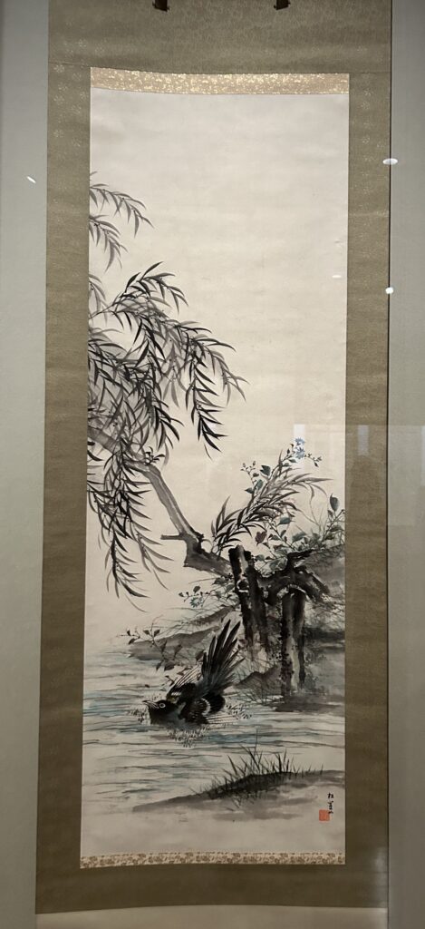↑柳陰鵲之図(りゅういんかささぎのず)。師、鈴木松年(しょうねん)の許しを得て幸野楳嶺(こうのばいれい)の塾に入った事のある松園。松年塾で身につけた大胆な筆遣いと、楳嶺風の柔らかい筆致が共に生かされた作品。