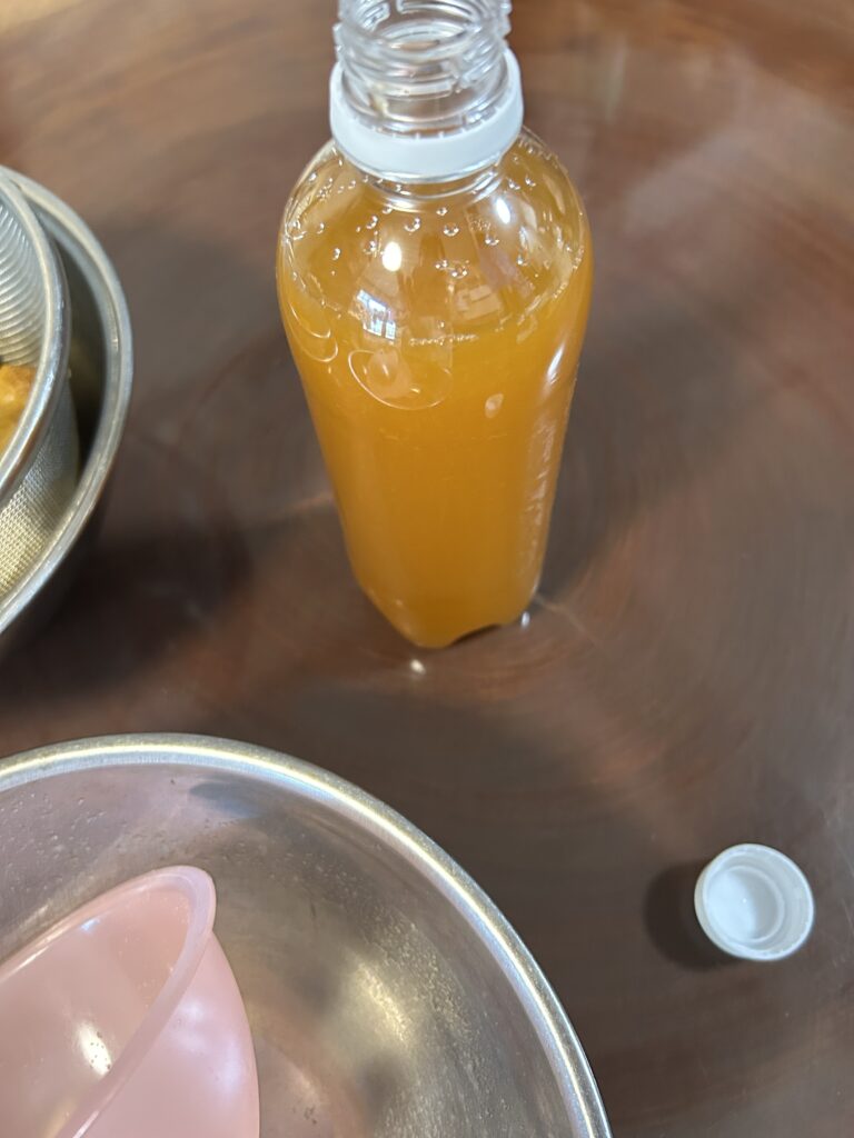 1キロの梅を漬けた汁は、ちょうど500ミリリットルだった。少しビニールの中にこぼれていたから、実際にはもう少しあったはずだ。実家に持って行った方は、もっと果肉が混じっていたのに、2キロ分で1リットルには達していなかったのは不思議だ。