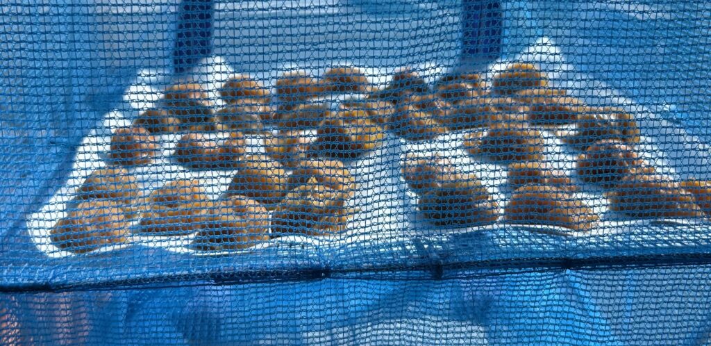それにしても、一度に3キロは干し切れないと思ったから、干す前に実家に持って行ったのに、1段で1キロ並べられたという事は、3段あるのだから3キロ干せるという事だった。干してから持って行けばよかったかな。でも手間がな……。