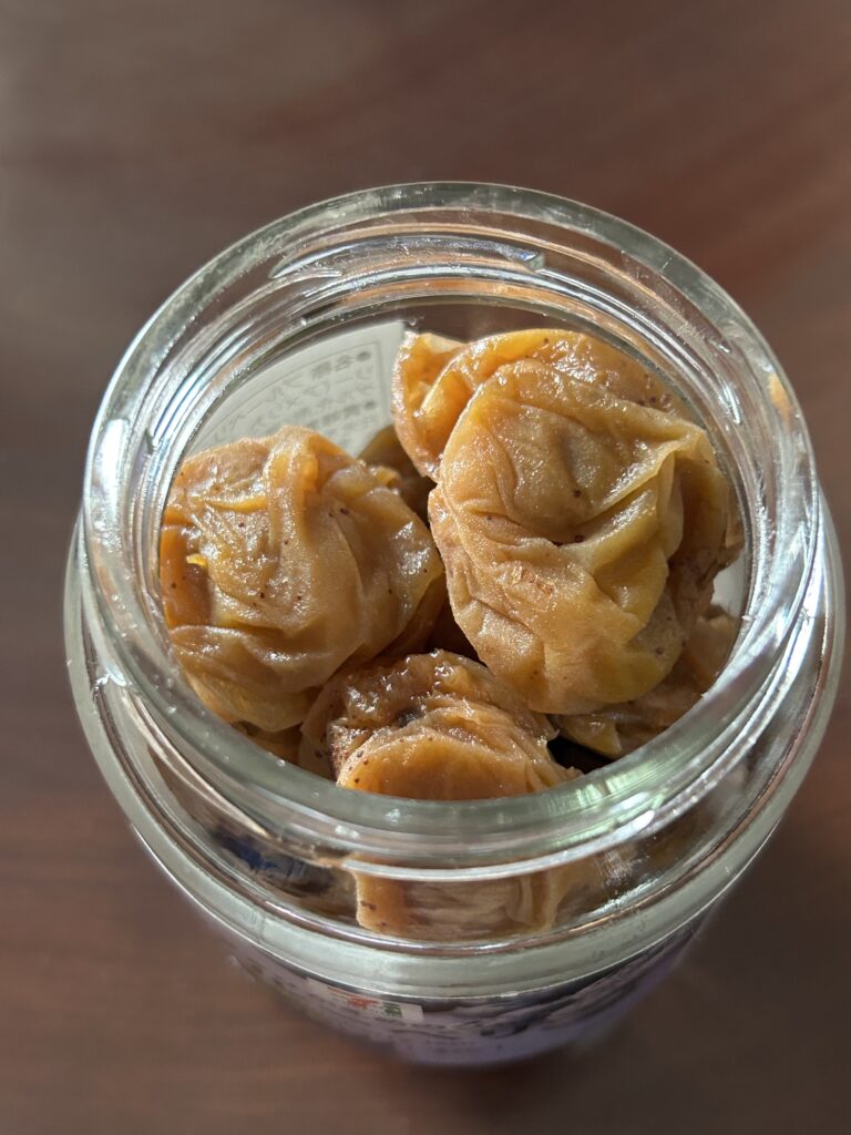 やっと、やっと食べやすいまろやかな梅干しが出来た。いつも、砂糖の割合を増やしてもダメだったのだ。やはりレシピ通り、氷砂糖を使ったのが良かったのだろうか。重しをしたのが良かったのか。