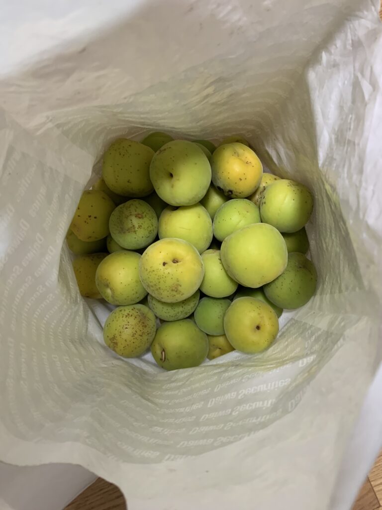 土曜日に長男が、おばあちゃんちの梅の木から、実を収穫して来てくれた。