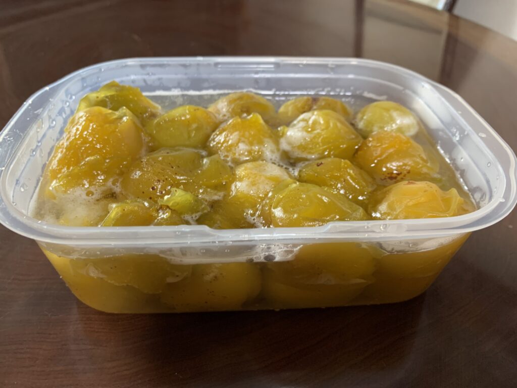 一度、三温糖で浸けてみたら、色が濃くなった。けれども、やっぱり白い砂糖の方がいいかなと思って、今年も白い砂糖で漬けることにした。