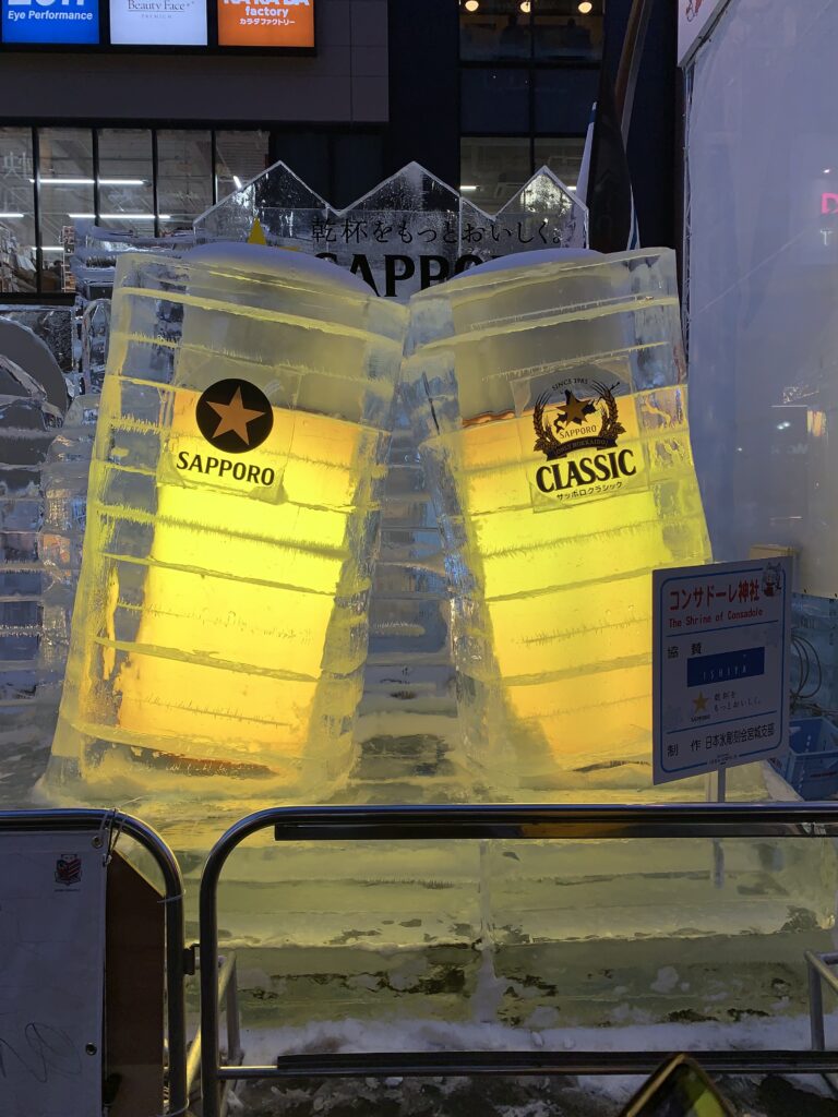 すすきの会場にあるのは氷像だ。ここに来るまでよく知らなかったが、大通り会場が雪像、すすきの会場が氷像の展示なのだ。そして5時ならもう、ライトアップされていた。