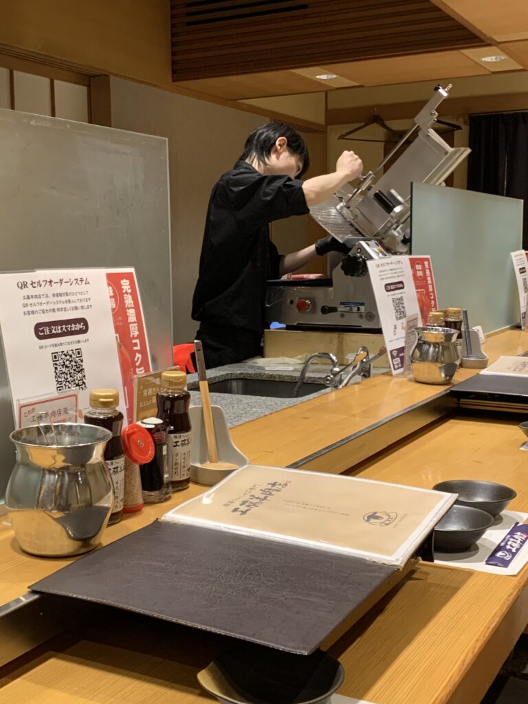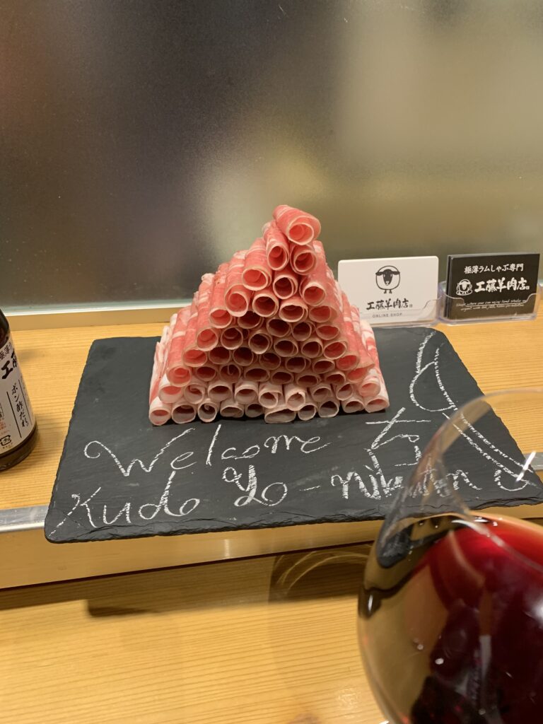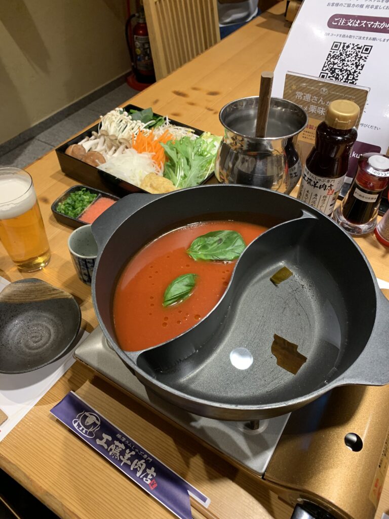 羅臼昆布だしと、トマトだしを選んだ。注文を受けてから、ラム肉をスライスするんだって。機械でシュー、シューって削ってる。