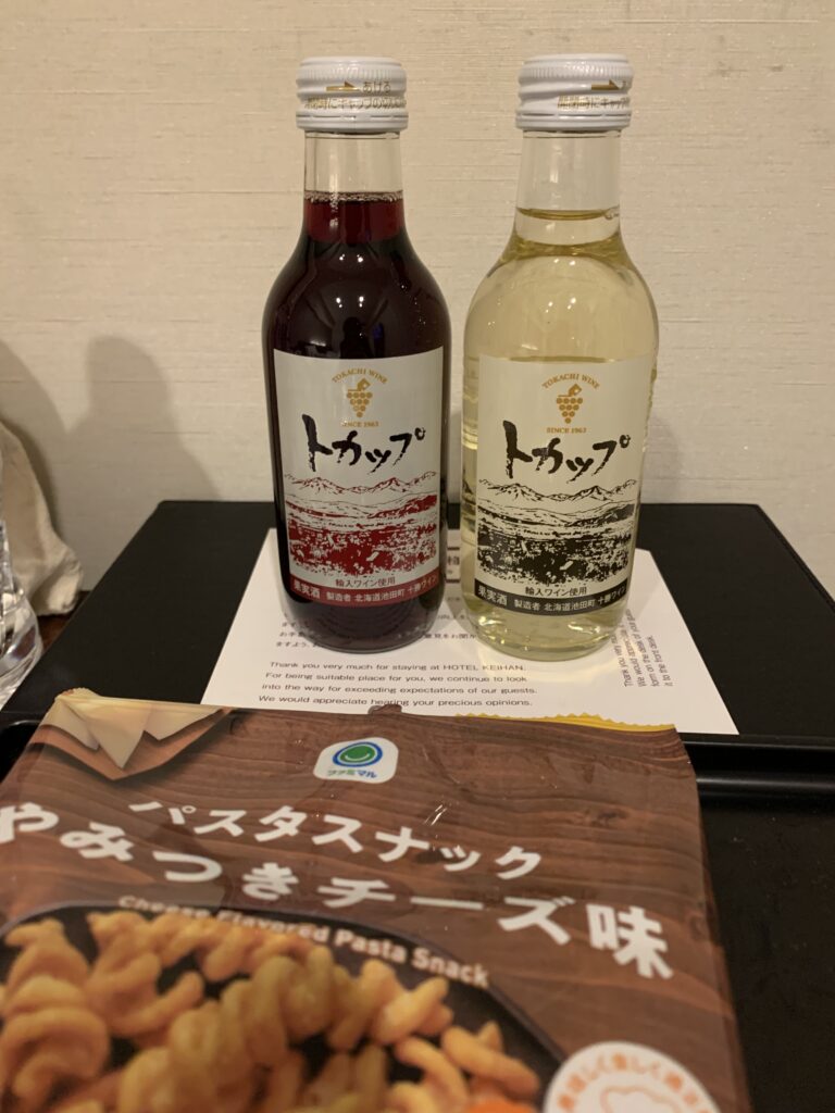ホテルに帰る時に、コンビニに寄った。また夫がビールを買うと言う。今日は木曜日だし、夕飯にワインを一杯飲んだと言うのに、だんだん夫のペースにハマって来たのか……コンビニで思わず見つけたワイン。そして、ついついおつまみも。