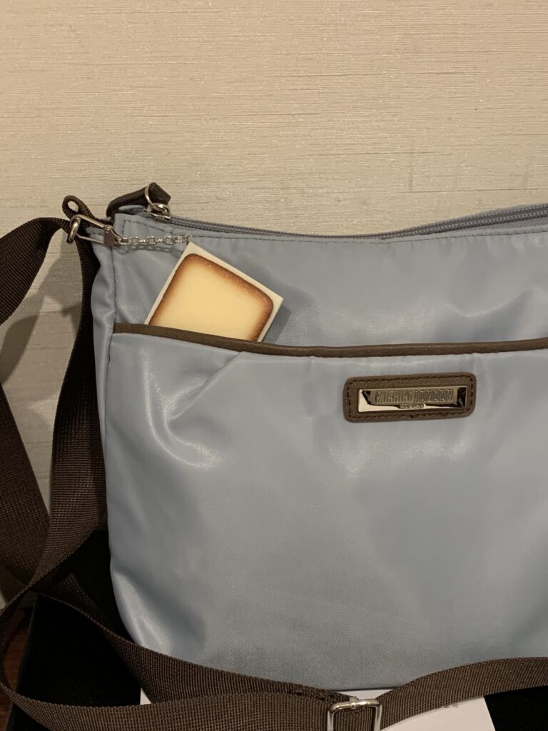 色がバッチリ。でもね、ぶら下げて歩いていると落とすから、こうやってポケットに入れておくのだ。なんだか、本物のお菓子が覗いているみたいじゃない?まあ、結局バッグを替えると持ち歩けないからと、定期入れの方につけ直したのだが。