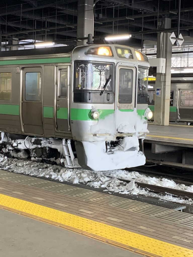列車の顔がいかつい。線路の雪かきをする物が付いている。東京の電車にもこれがあれば、雪が降っても大丈夫なのにね。