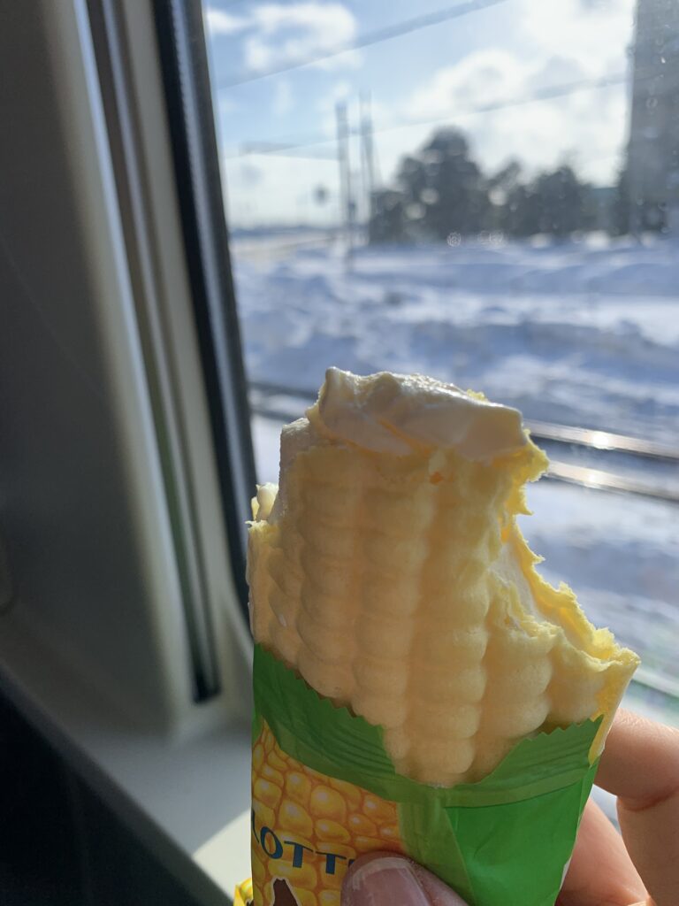 やっぱり溶けていた。そこが美味しいとも言えるが、噛むのが難しい。でも、列車で食べたよーという証拠写真を上げる。これ、てっぺんにはアイスが入ってなかったから、逆から食べれば良かったかも。