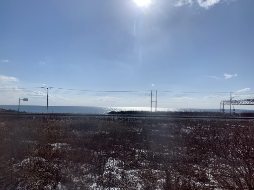 太平洋側へ来た!海が見えるよー。雪も少ない。