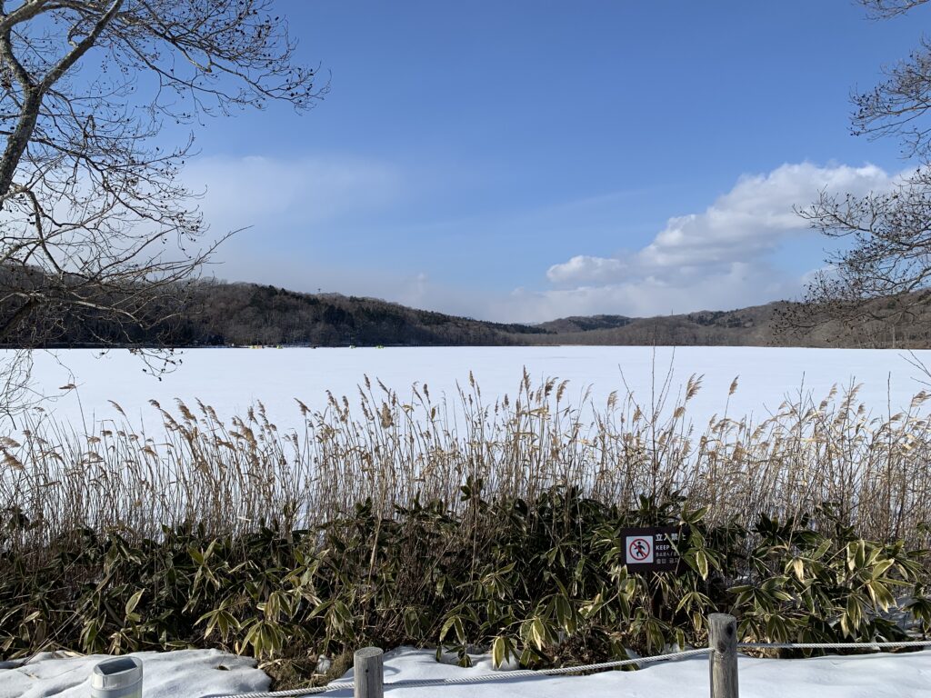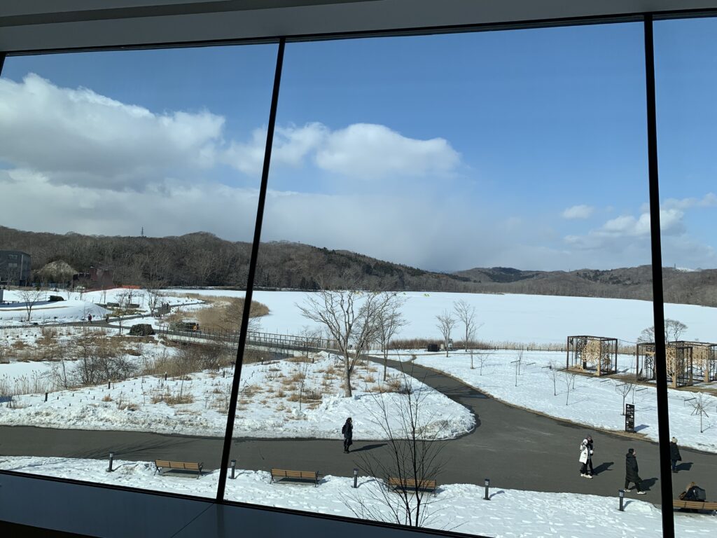 2階へ上がると窓が大きくて、すごい景色。目の前に広がるのは「ポロト湖」だ。凍っていて、その上に雪が積もっている。テントがあったりしてワカサギ釣りかな?
