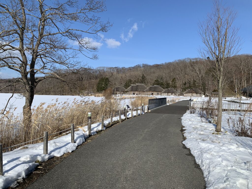 向こうにアイヌの家が見えてきた。