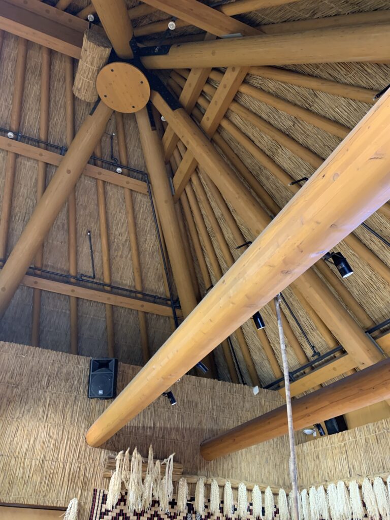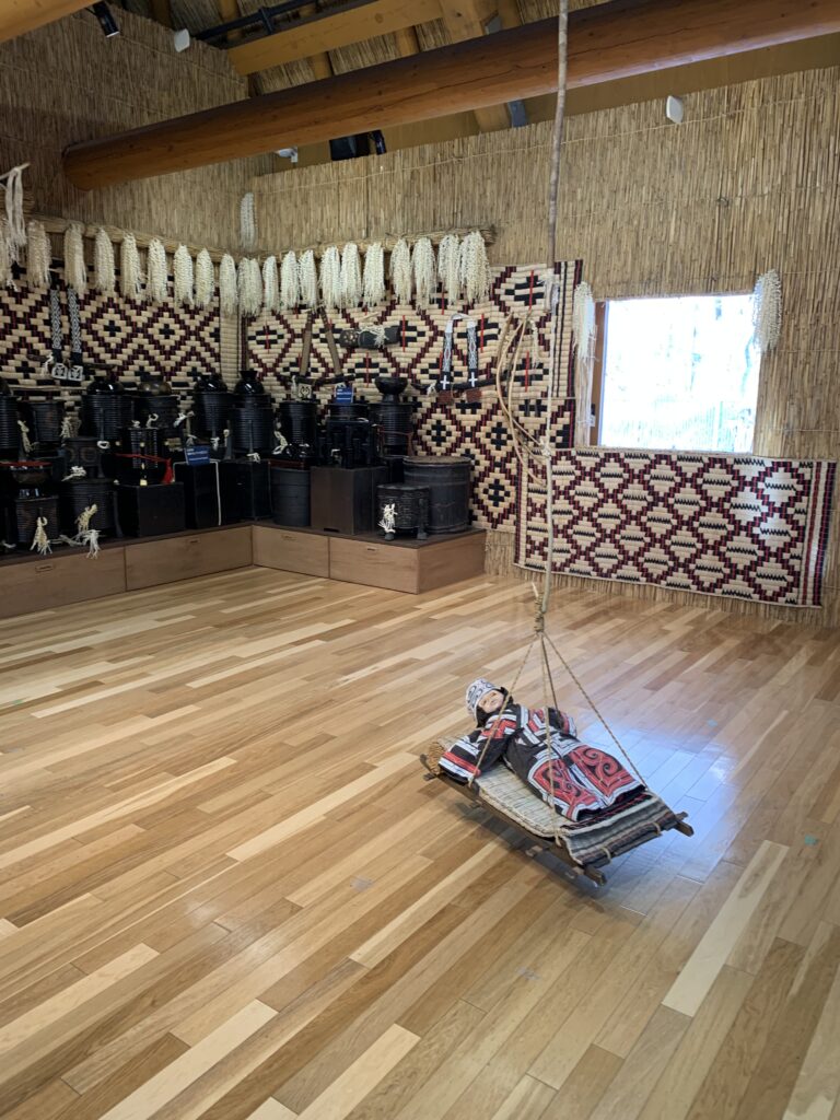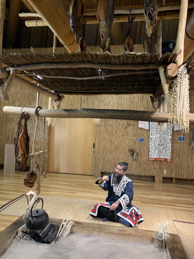 家の中で、語り部(かたりべ)による語りを聞いた。千夜一夜物語みたいなやつだと言われたが、それが全部アイヌ語だった!びっくり。でも、日本語でその後説明してくれた。