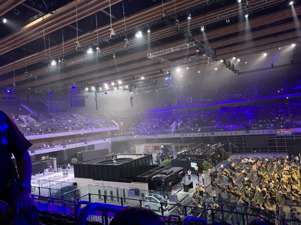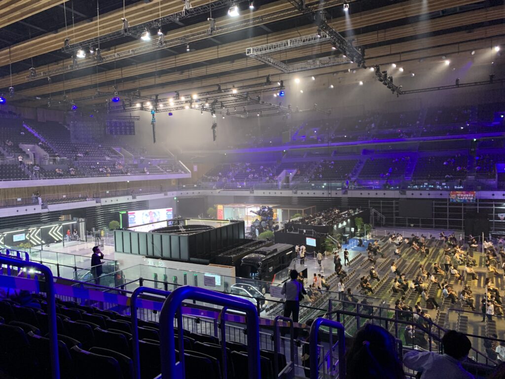 アリーナの半分ほどに椅子が並べてあった。今日の前半のボランティアの方々が、活動の後にこの椅子を並べてくださったそうだ。もう半分には、イベントのあれやこれ、ロボットや車などが置いてあった。そして、ぐるりと囲む客席には、それなりに人が入っていた。まあ、満席とは言えない。